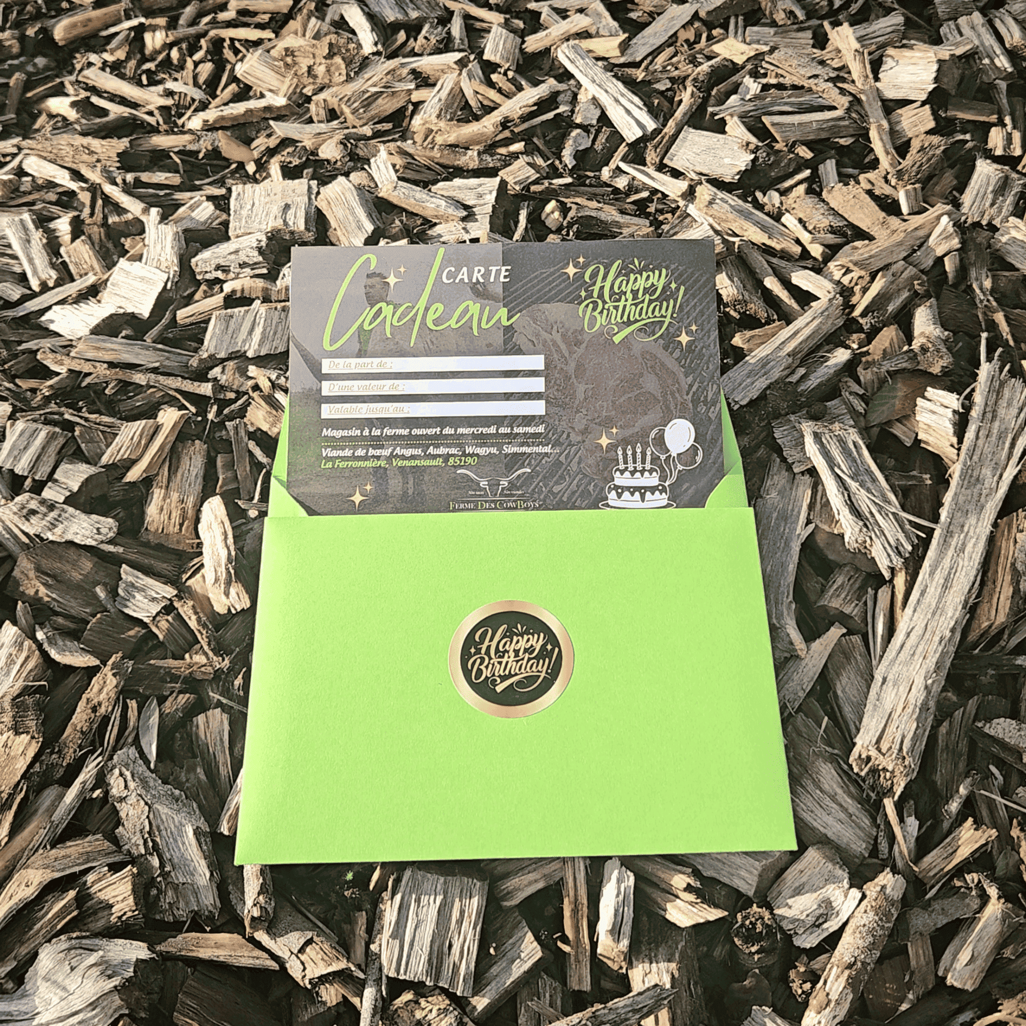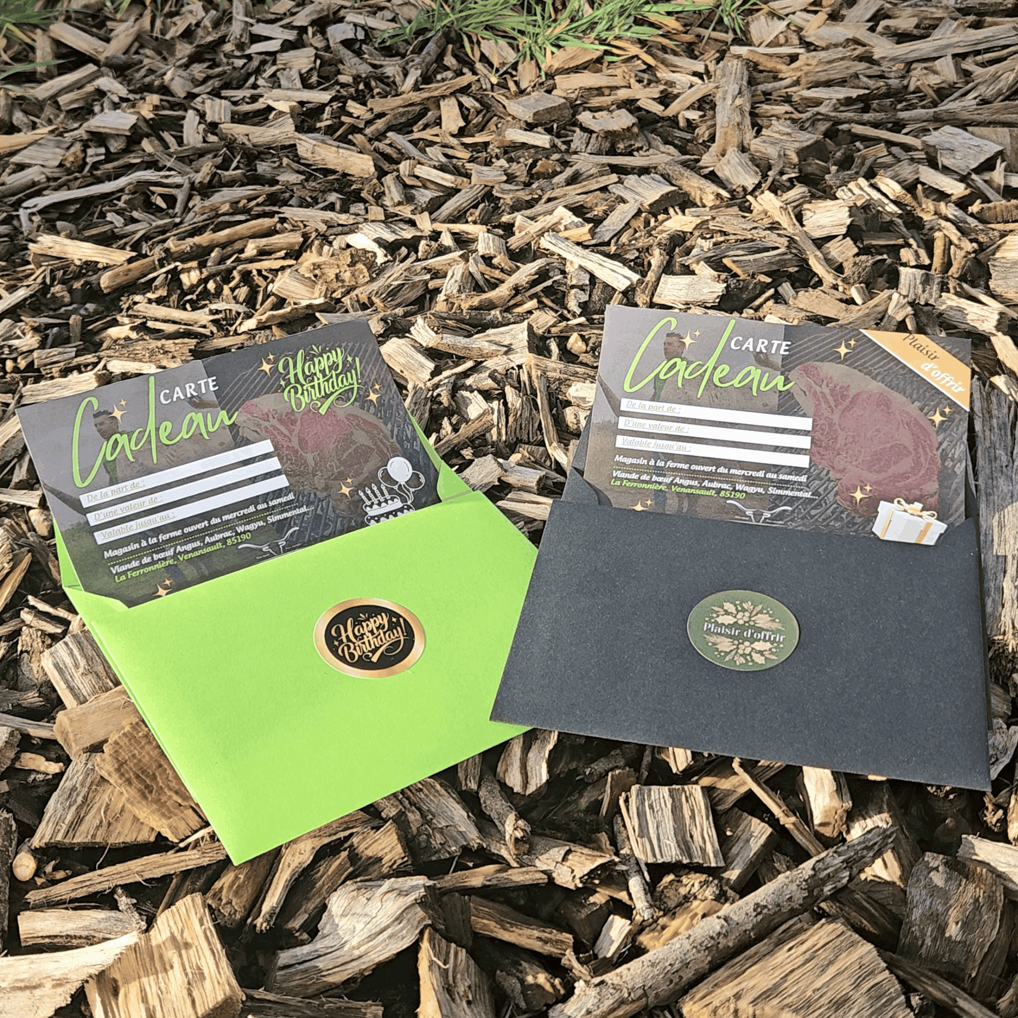 Offrez le plaisir de choisir avec nos cartes cadeaux ! Parfaites pour un anniversaire ou simplement pour faire plaisir à vos proches. Sélectionnez le montant souhaité et laissez vos proches profiter de notre viande et produits de la ferme