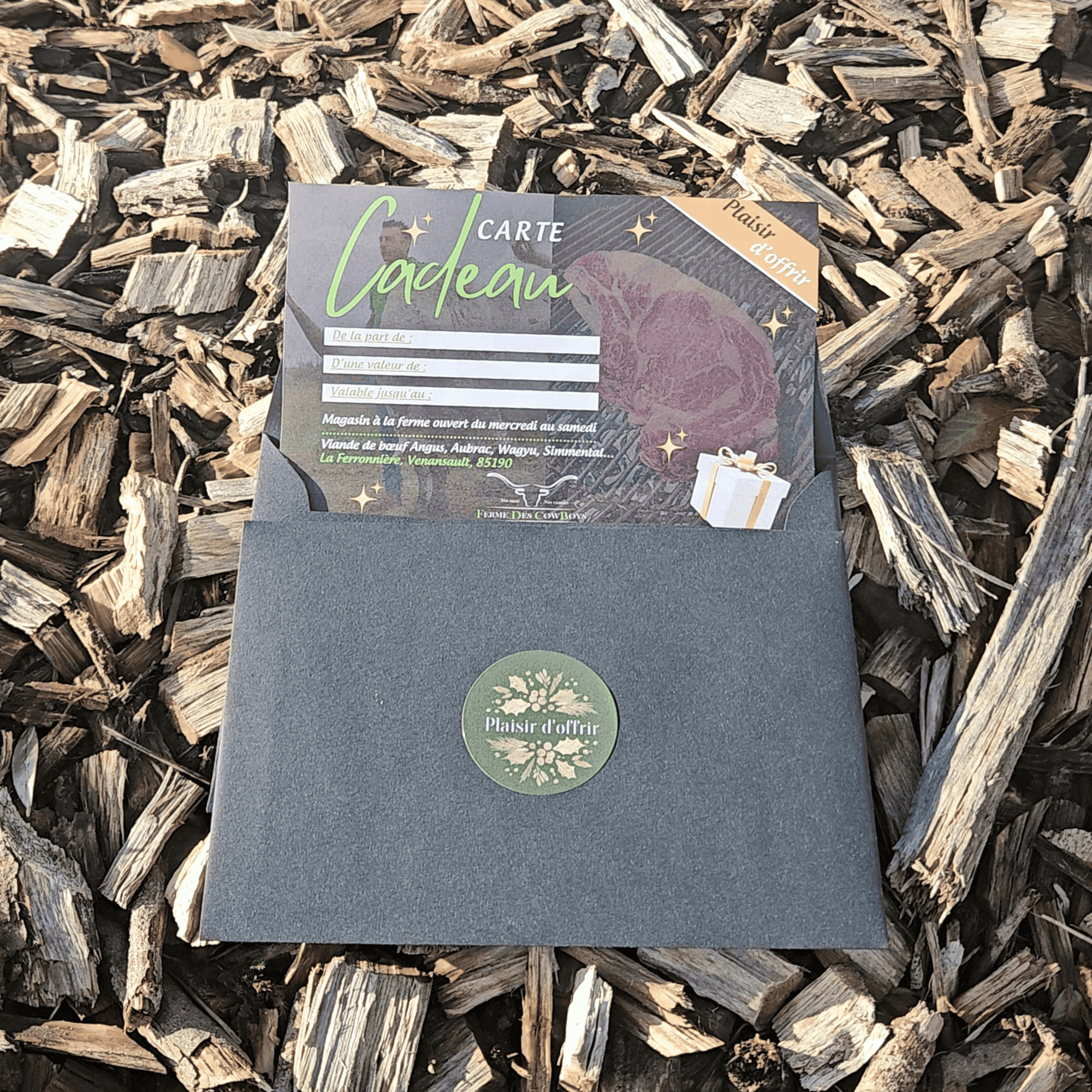 Faites plaisir à coup sûr avec la Carte Cadeau de la Ferme des Cowboys. Idéale pour un anniversaire, pour le plaisir d’offrir ou toute autre occasion, elle permet à vos proches de choisir librement parmi nos viandes, plats cuisinés et produits de la ferme.